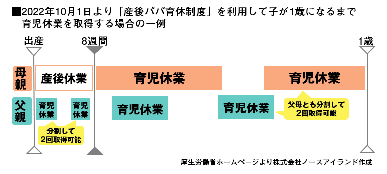 今年10月から新しくスタートする「産後パパ育休制度」は、出産後8週間以内に4週間まで、父親が従来の育休制度とは別に休業を取得できる制度です。事前に申請することで、2回まで分割して取得することができます。別途、従来の育児休業についても、これまで原則不可だった分割取得が2回まで認められますので、合算すると4回に分けて休業を取得することが可能になります。一度に長期間の休業取得は難しい場合においても、計画的に分割して取得することが可能になることで、今後は父親の育児休業取得が増加することに期待が寄せられています。