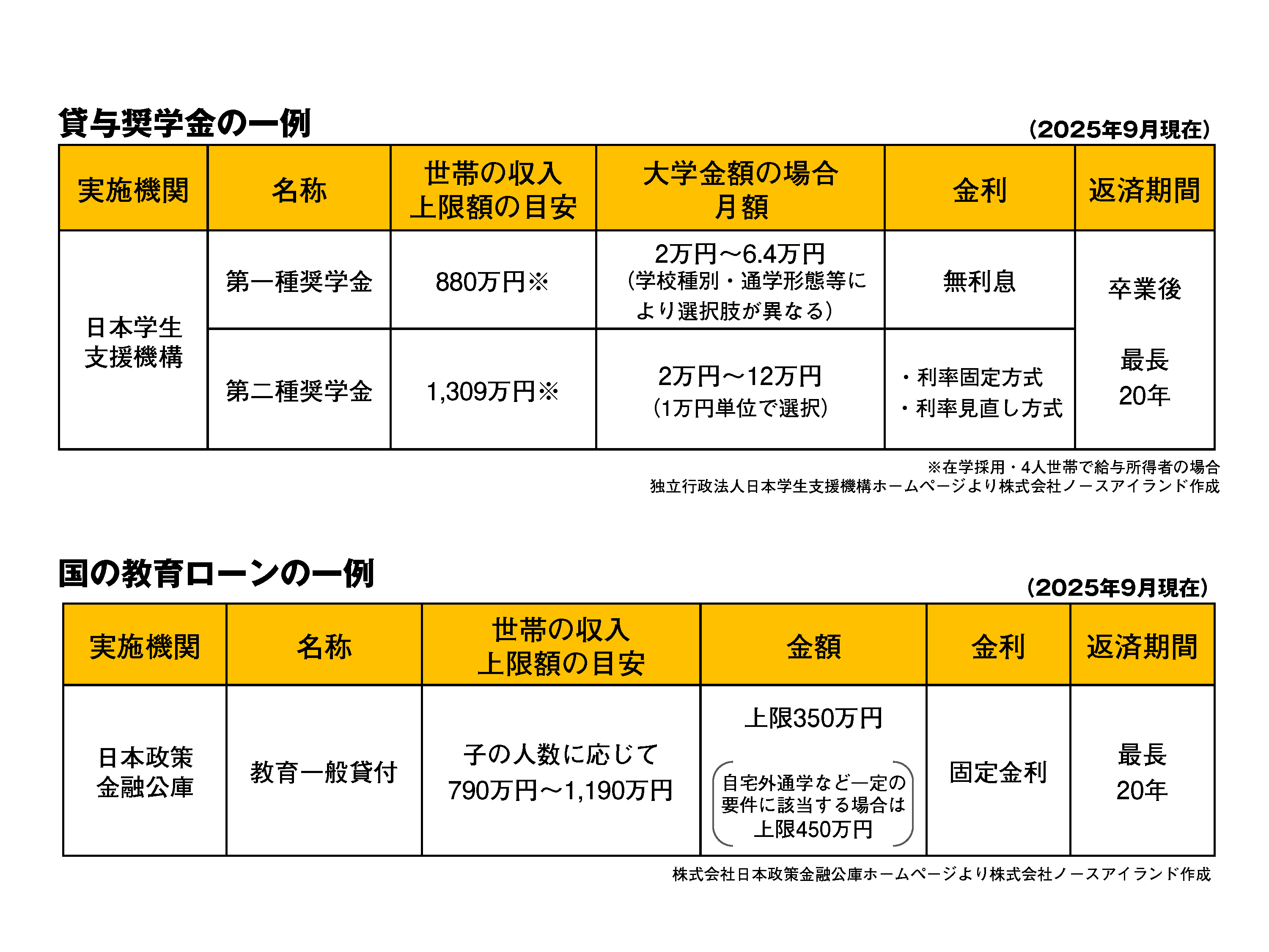 貸与奨学金は進学する子ども自身がお金を借りる方法で、学校内に窓口が設けられています。独立行政法人日本学生支援機構の奨学金は有名ですが、子どもの学力や親の所得制限等の条件によって、無利息のものと年利3%を上限とする利息付のものとに分けられます。