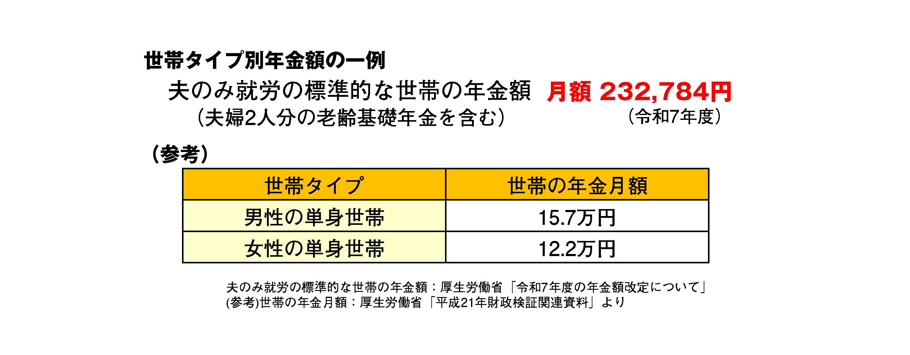 セカンドライフの収入の柱となるのが「老齢年金」。現役の時から年金受給額のおおまかな目安は把握しておきたいものです。たとえば会社員の男性の年金額を単身でみた場合、厚生年金から月10万円程度、国民年金から月6.9万円程度の計16万円前後が1ヵ月の受給額と試算されます。夫が働き、妻は夫の扶養家族であった場合(夫のみ就労)には、男性の単身年金額に妻の国民年金部分である月6.9万円程度を足した約23万円が平均とされています。世帯別の目安金額は図表を参考にしてください。
